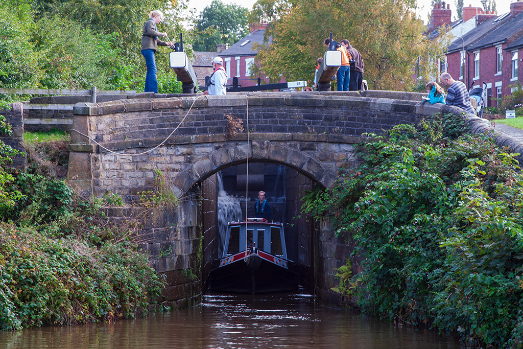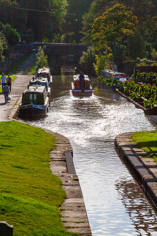 At Marple, you find a staircase of 16 locks. This is an old canal, and the lock gates are quite leaky. As I stood at the helm, I found that I was being sprayed as we dropped lower in each lock, so waterproofs and a hat were called for. Partway down the staircase, the water began rushing even more, and I was standing under a waterfall! I looked ahead, and discovered that Harriet had decided that it would be efficient to open more gates, instead of waiting for us to complete the transit of the lock. She never really understood the way locks operate on the canals. If you open multiple doors, the weight of water will prevent them from being closed again, and ultimately it becomes possible to drain the canal! Harriet’s enthusiasm could have been an absolute disaster, but fortunately she heard our shouts and stopped rushing ahead.