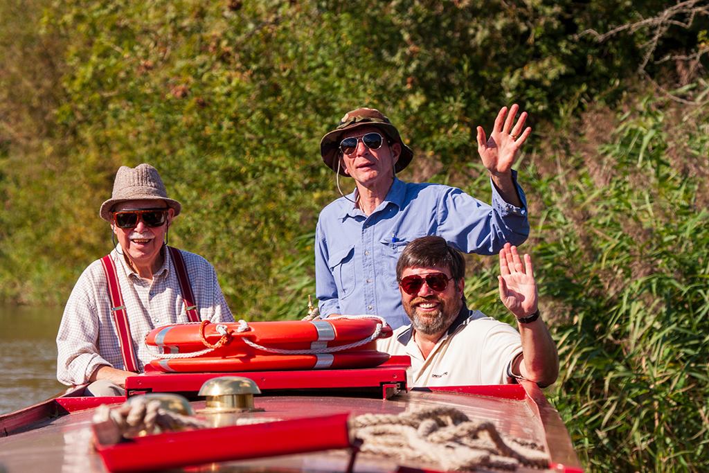 One evening we tied up in a large basin in the town of Ellesmere. We all went off to have dinner at a nice pub on the other side of the basin. Partway through dinner, a man came into the pub and was clearly looking for someone. He caught sight of Dick and came over to our table. He explained that some yobs had untied one of our boats, and were hoping to see it float away downriver, but he had managed to catch the lines, and it was safely rafted to his boat. He told us to take our time and finish our dinner, and when we came back, he would help us untie it and get it back in place. As we made our way back to the boats, we could see a group of young men hanging around watching, clearly hoping that we would panic and rush about and provide excellent entertainment. They were of course disappointed. Prewarned, we all calmly set about getting situated again, and we thanked our benefactor. He told us that he saw us arrive and Dick is quite distinctive, and he had been confident that he would be able to find us in the pub to give us warning!