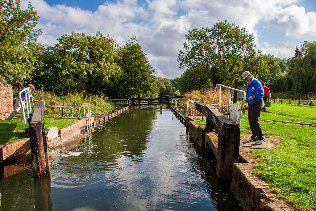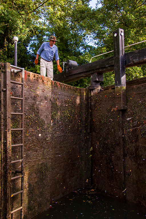 Angela and Richard, my cousins, were great boating companions. Dick and I had spent time with them when we were at university, and we had also lived in Calgary, so we have always been close. We managed to gather all our crew and embarked on the two boats on time. As we arrived at the first lock, I was surprised to see everyone on board jump off the boat and race up the hill to the lock. This left me with nobody to untie the bow of the boat, not to forget that at 69 feet long it is also very helpful to have someone on board at the bow to signal when we are close to the upper doors and centered in the lock. After that initial slight glitch, the whole operation went well, and we were also able to get into a routine where Dick and Richard operated the locks for Dad and Mum’s boat as well, with some help from George.