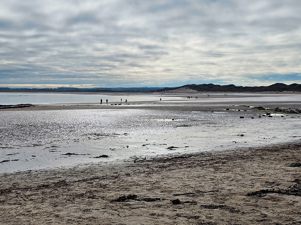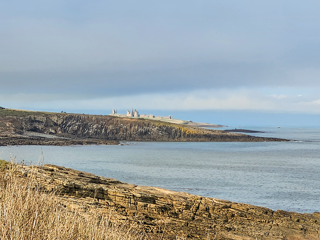Dunstanburgh Castle and cliffs in the distance. The cliffs are a habitat for seabirds. You can only visit the castle by walking along the beach for a mile and then climbing up the steep cliff path.
