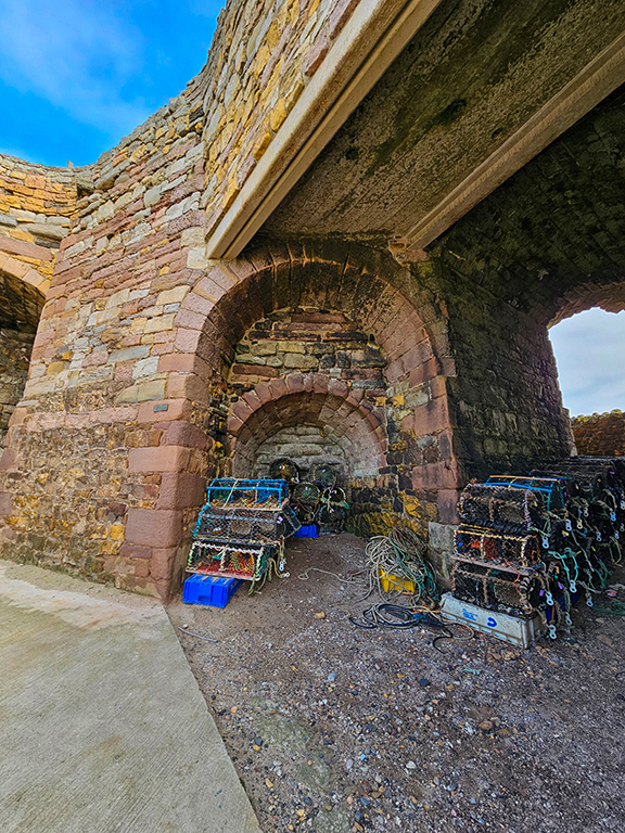 In 1798, Richard Pringle began building a lime kiln in Beadnell for John Wood, a local landowner.  The limestone and coal were extracted from Wood’s estate, and the lime sold so well that two more kilns were quickly built.  Each kiln produced at least 1000 carts of lime each year, which was mainly exported to Scotland, but some was used as fertilizer in nearby fields.  The business was short-lived, in just over 20 years the kilns had fallen out of use.  They were used by local fishermen for curing herrings, and today they are storage for lobster pots.