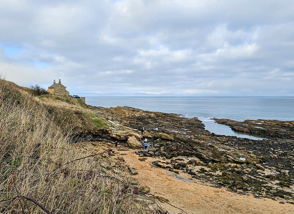 The beach at the Bathing House is a fascinating geological area, with soft sandstone instead of the dark Whin Sill.  The eroded sandstone creates interesting pockets and pools that would have been perfect for safe swimming for the children of the Earl (as it is for visitors today).  Looking north, you can see the magnificent Dunstanburgh Castle on top of the cliff.  Although open to the public, it is not an easy castle to visit.  The closest you can get to it by car is one mile walk along the beach.  It is an atmospheric ruin, but after you have trekked along the beach there is the imposing cliff to climb as well.