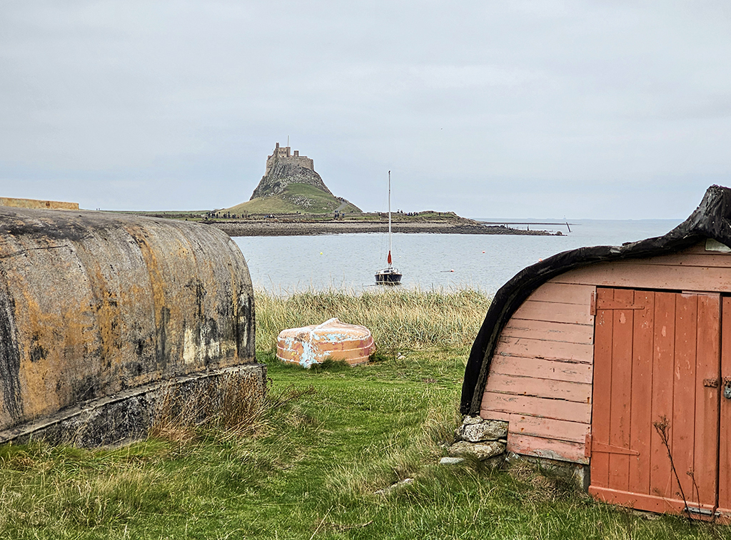 Lindisfarne, one of the boat sheds and the castle in the distance across the harbour.