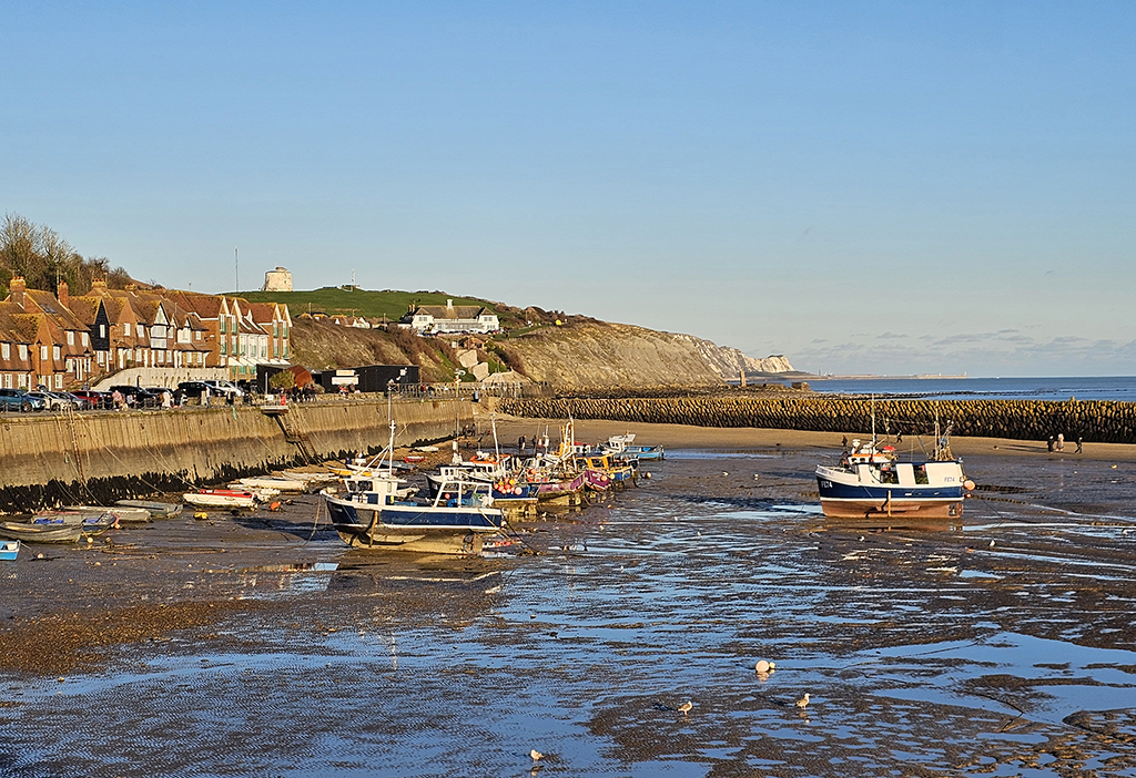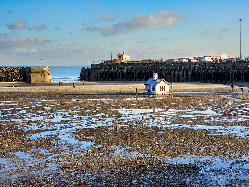 In addition to picturesque fishing boats, the harbour has a tiny floating pink house, part of an art festival celebrating Folkestone’s Triennial in 2017. Several of these colourful “Holiday Homes” were placed around the town, but the floating one in the harbour captured the imagination and has become a favourite attraction. I also noticed a brick sculpture of a hand that rises above the sand and is only seen at low tide.