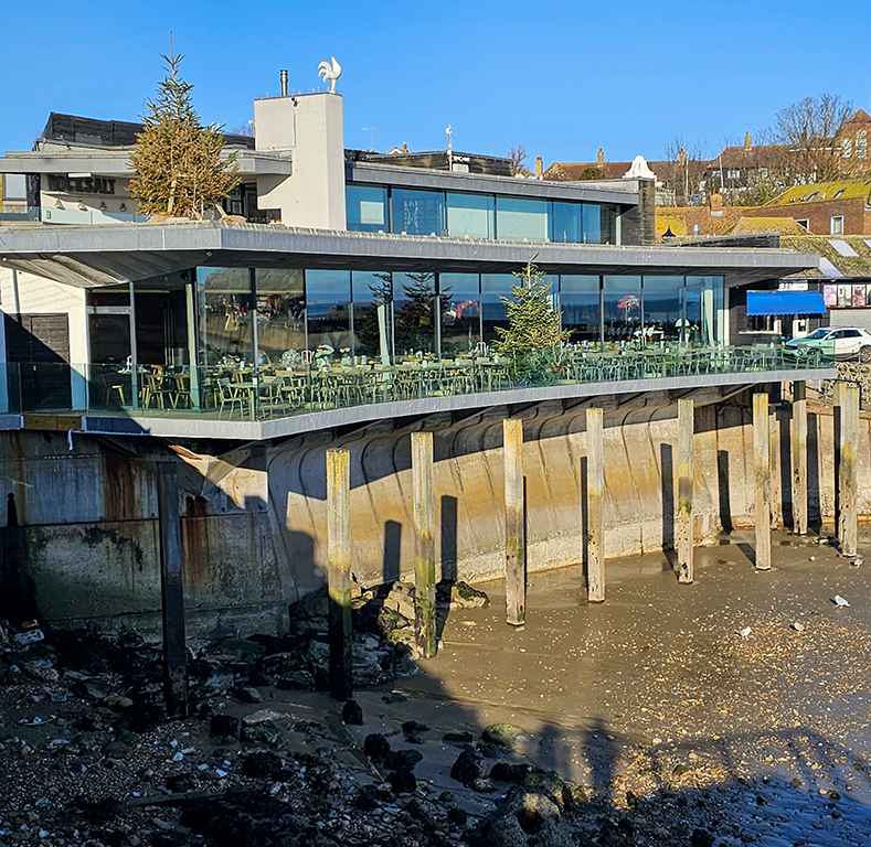 A large pier and harbour was built in the 19th century, including a railway station that brought travellers from London to the ferry port for passage to Boulogne. In recent years the Harbour Arm has been restored and rebuilt as a recreational space, with the railway closed and pedestrian access to a large market space, as well as parking. There are future plans for further construction. The harbour is still in use as a fishing port. The restaurant we planned to visit is a new building overlooking the harbour, with excellent views and outdoor dining for warmer days.
